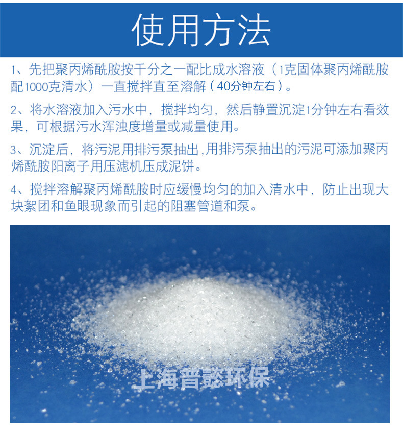 2、在制造過(guò)程中加入適量的能與酰氨基產(chǎn)生氫鍵的低分子物質(zhì)(如尿素等),以減少凈水絮凝劑pam分子鏈間的氫鍵數(shù)量;混入致孔劑(如硫酸鈉等),遇水時(shí)這些低分子物質(zhì)很快向水中擴(kuò)散溶解,形成有利于水分子向PAM方向滲透擴(kuò)散的通道;加入親水型的表面活性劑即所謂滲透劑(如烷基聚氧乙烯醚類(lèi)),PAM顆粒與水接觸后在表面形成親水膜,降低水的表面張力,促進(jìn)水向顆粒的擴(kuò)散和聚合物的溶解 。
